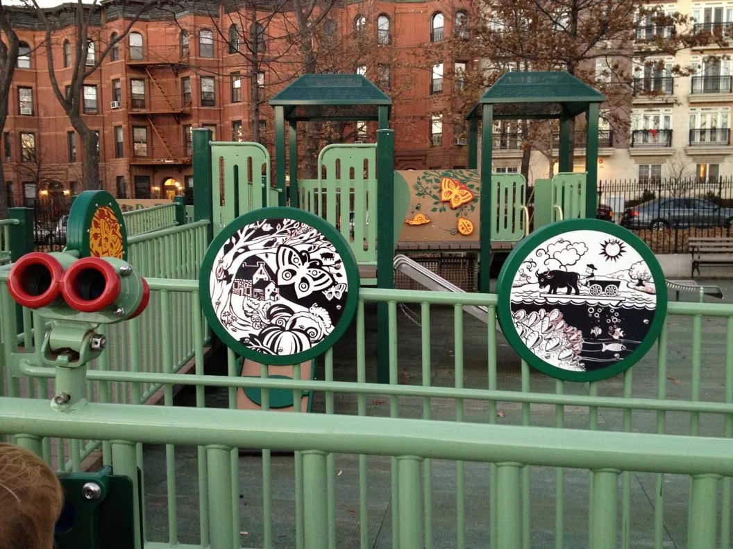 Playground art for the New York City Parks Department. Designed thirty different elements for three play structures/experiences: a colonial themed farm scene with cut-out metal animals, custom panels based on The Old Stone House historic site and custom panels based on a submarine theme, all retrofitted with unique play experiences. Click on the images above for more information and larger views. You can also see great pictures of JJ Byrne at Time Out New York Kids and Mommy Poppins.